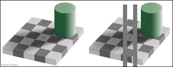 It is important to understand this, that Hue , Chroma (Saturation) and Brightness (Value) are all subservient to some natural laws (as described definitively by Michel Chevreul in 1839), outlined next page. Observe squares A and B, which appear to be of different values, but in fact, are identical, however, Adelson shows their relative positioning changes their perceived value.