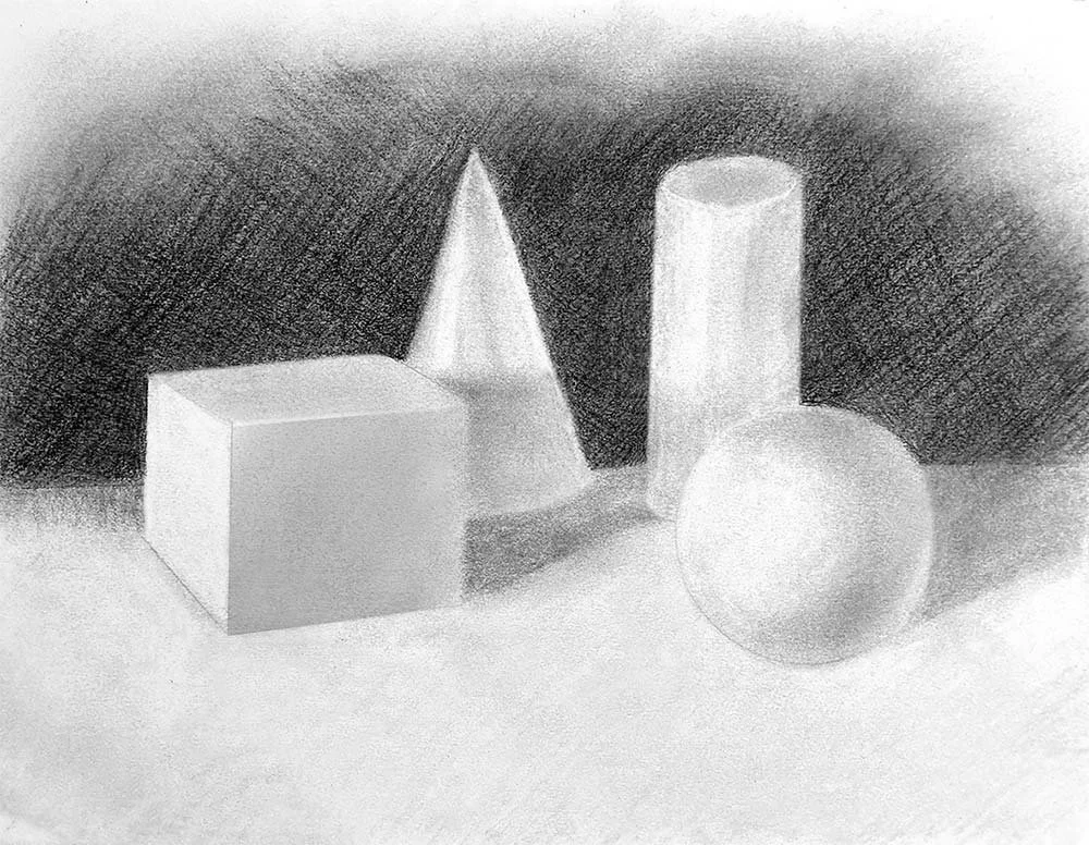 Create these basic shapes. Start with the simple steps to building each shape, then add the shading for the form shadows and cast shadows as shown, in the space to the right.