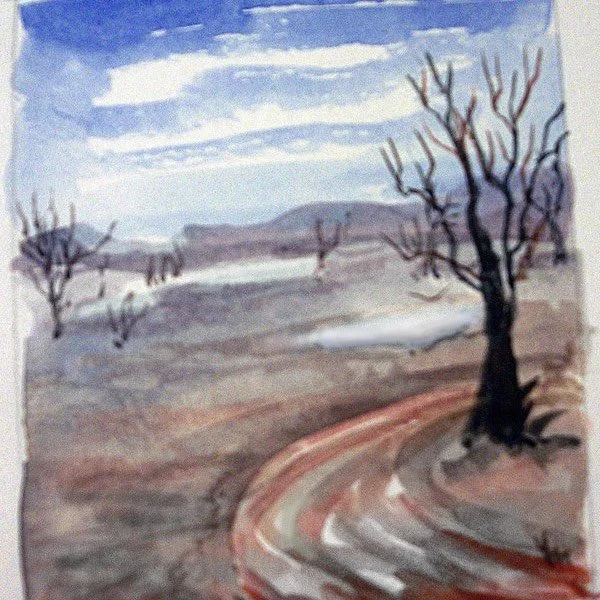 6. With a blackish mixture and a liner brush, add some dead tree shapes, making them finer and lighter as they recede into the distance.