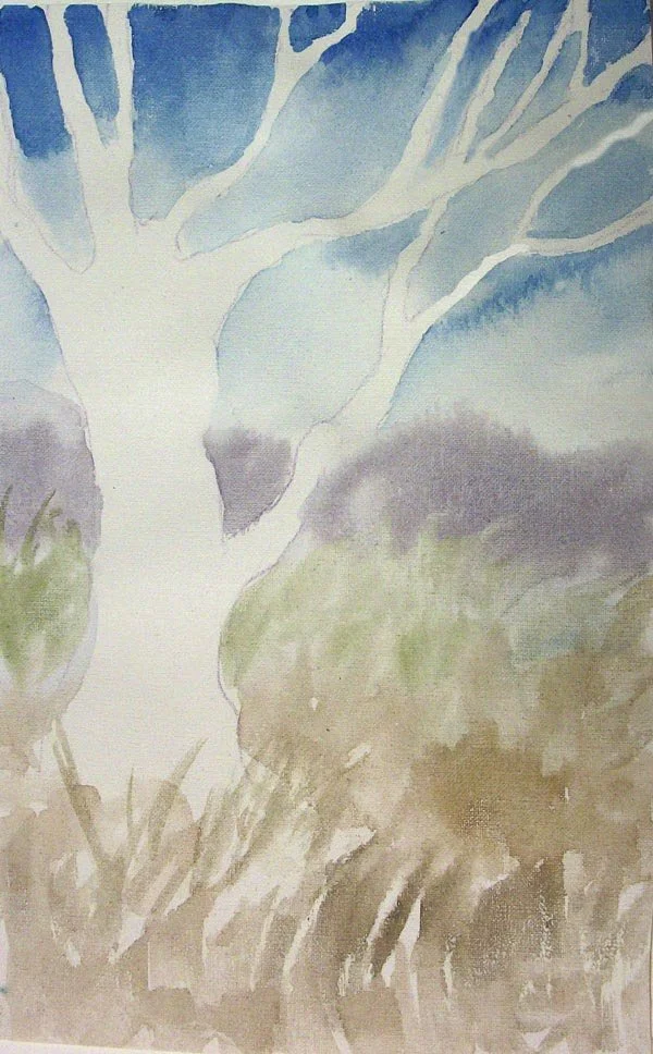 g. Before the next layers below, liquid masking frisket has been applied to parts of some branches, the trunk and foreground grassy areas to preserve highlights.(where the sun is highlighting branches, trunk and over the dried layer of foreground grass where the lighter blades of grasses will be painted in later as the layers build up.)